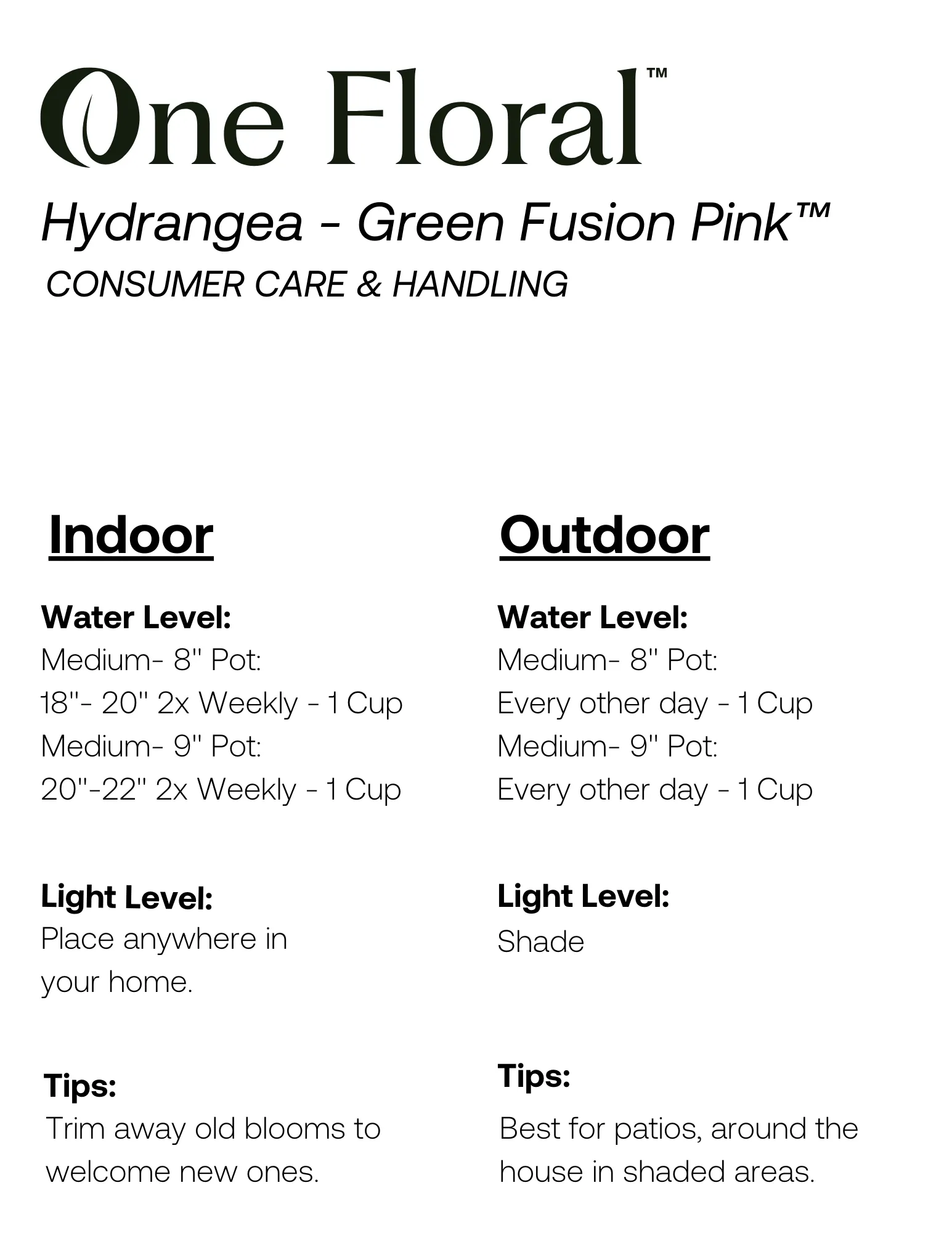 The Green Fusion Blue Hydrangea is a stunning floral creation, blending shades of green and blue into a visually beautiful display. Its vibrant colors not only catch the eye but also intensify as the blooms undergo a mesmerizing color transformation. Offering long- for over 30 days, this hydrangea is a versatile addition to any space in your home, effortlessly enhancing its surroundings with its ever-changing hues. The Green Fusion Blue Hydrangea is a stunning floral creation, blending shades of green and blue into a visually beautiful display. Its vibrant colors not only catch the eye but also intensify as the blooms undergo a mesmerizing color transformation. Offering long- for over 30 days, this hydrangea is a versatile addition to any space in your home, effortlessly enhancing its surroundings with its ever-changing hues. For indoors—smaller pots, water with half a cup a few times weekly; for larger pots (8"+), water a couple of times a week using one full cup. For outdoors—best for patios and areas around the house in shaded locations—water every other day following the same ratio as indoor watering.