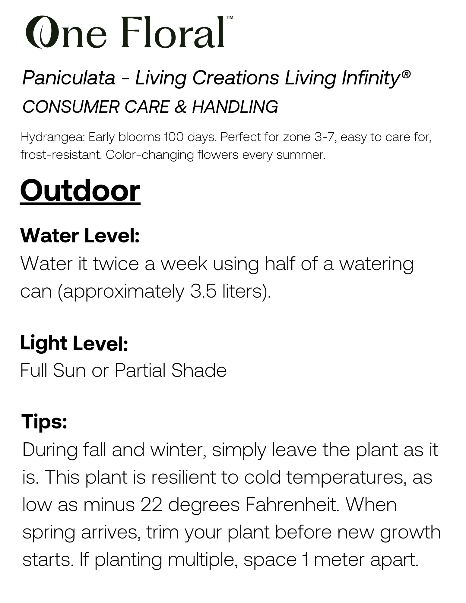 A special line of Paniculata Hydrangea that has it all! Enjoy early blooms for a stunning 150 days each year. Perfect for any climate, this hydrangea is super easy to care for and frost-resistant. You'll be treated to beautiful flowers every summer, with white blooms that gradually turn pink to dark red at the end of the season. It's a compact panicle with very hard and strong branches. A special line of Paniculata Hydrangea that has it all! Enjoy early blooms for a stunning 150 days each year. Perfect for any climate, this hydrangea is super easy to care for and frost-resistant. You'll be treated to beautiful flowers every summer, with white blooms that gradually turn pink to dark red at the end of the season. It's a compact panicle with very hard and strong branches. Place it in full sun or partial shade and water it twice a week with just half of a watering can. After its vibrant display in summer, simply let it be during fall and winter. When spring rolls around, give it a trim before new growth begins.